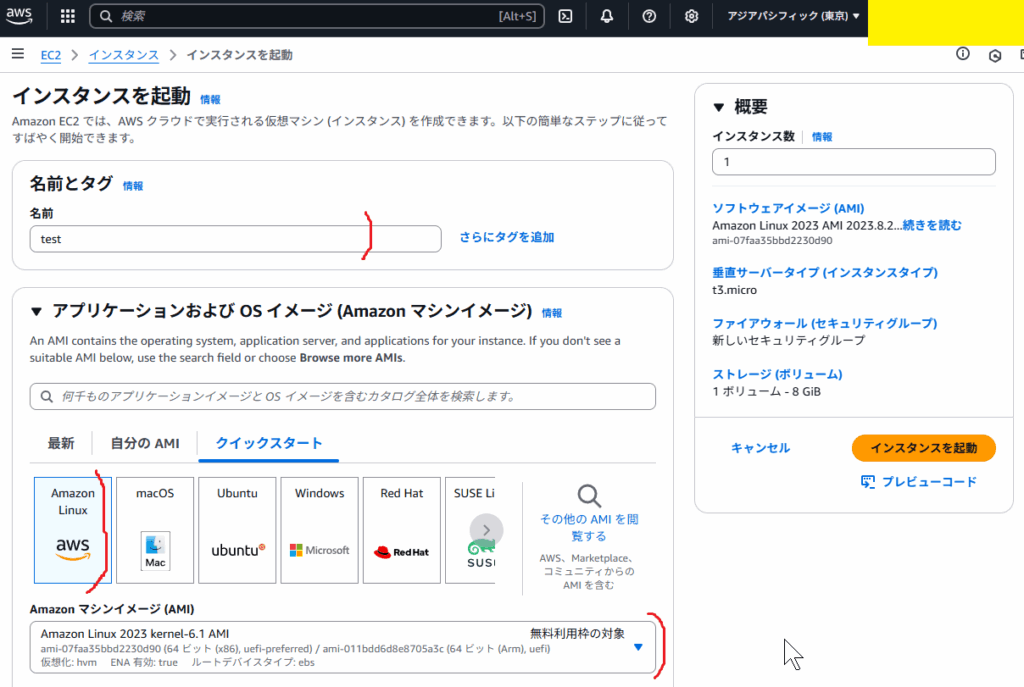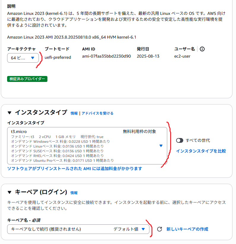 Amazon Linux 2023 kernel-6.1 AMI (“無料利用枠の対象”と表示があれば何でもOK)