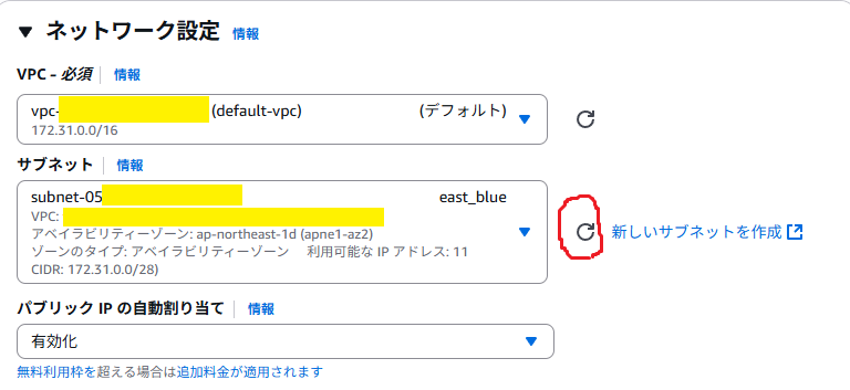 「EC2作成画面のタブに戻って、作ったサブネットを選択だ!更新ボタンを押すと表示されるぞ!」