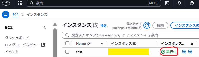 「最後に、インスタンス検索画面で、今作ったtestって名前のインスタンスが実行中になっていればEC2作成作業、完了だ!」