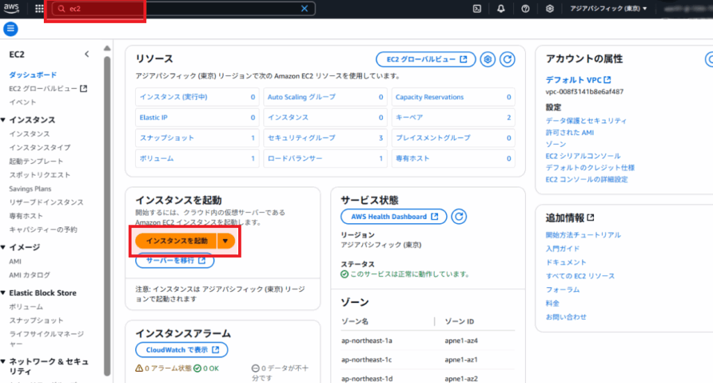 「よし!検索欄にEC2って入力して、“インスタンスを起動”ってボタンを押せ!冒険への第一歩だ!」
